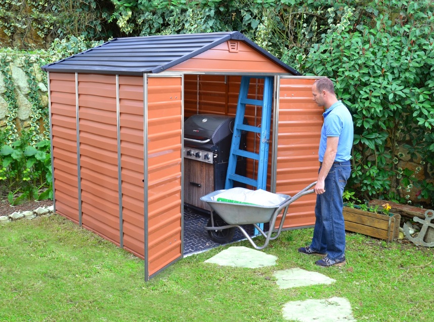 Plechový zahradní domek na nářadí s rovnou pultovou střechou pro uskladnění kola, sekačky a nářadí G21 GRAH-1132 hnědý za akční cenu s dopravou zdarma. Autorizovaný obchod G21, záruka a servis ČR, odborné poradenství.