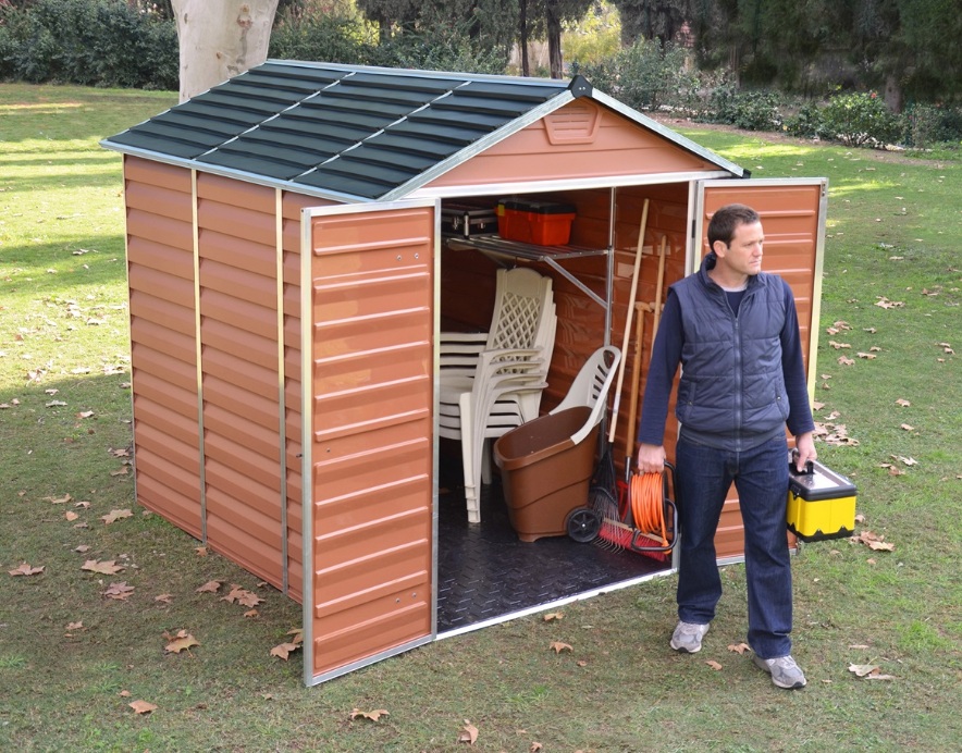 Zahradní domek na nářadí s rovnou střechou pro uskladnění kola nebo sekačky G21 GRAH 915 hnědý za akční cenu s dopravou zdarma. Autorizovaný obchod G21, záruka a servis ČR, odborné poradenství.