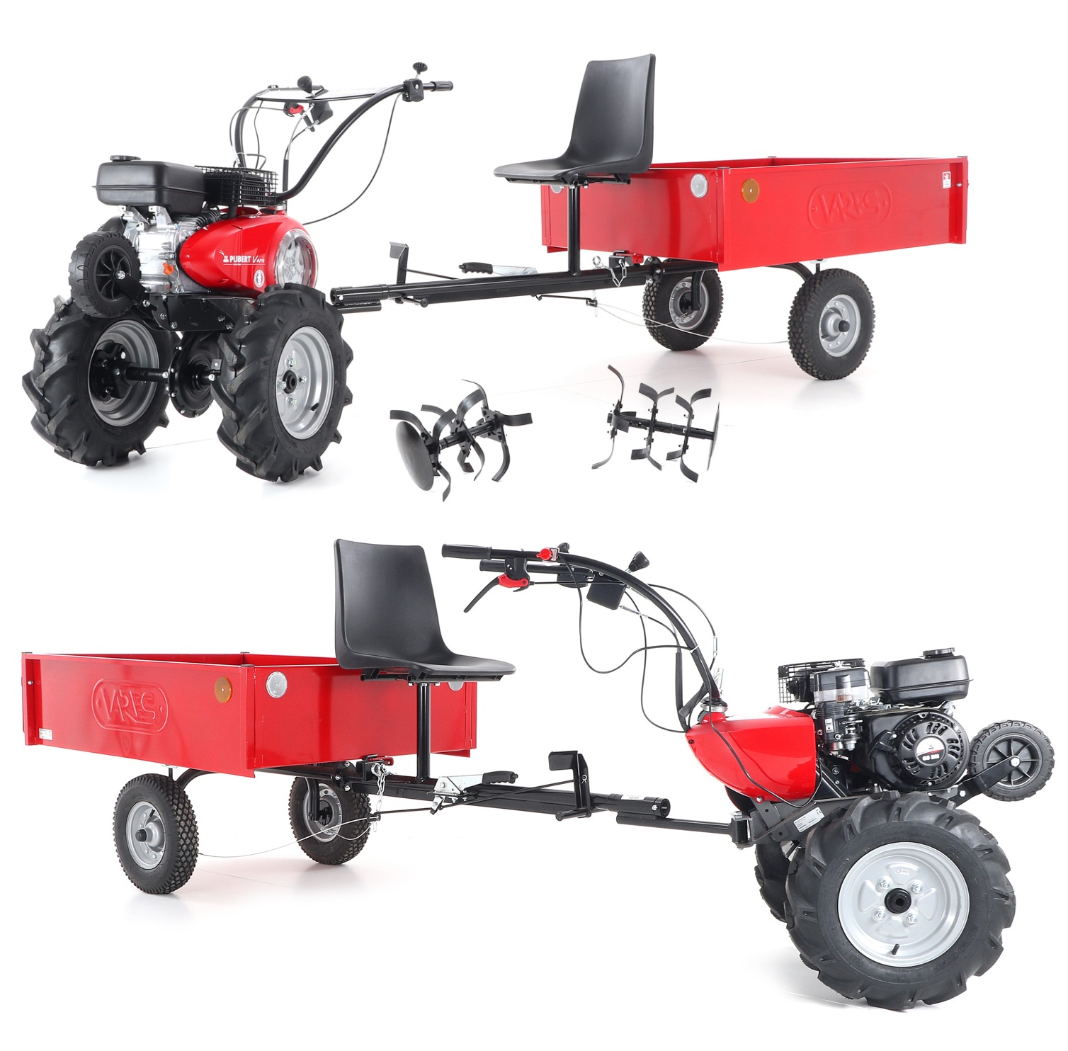 VARIO systém:VARIO je dokonalým nástrojem k "rozmělnění" půdy, odplevelení zeleninové zahrady, orání, vyorávání brambor, sečení a obracení trávy a v neposlední řadě i výborným pomocníkem v podobě malotraktoru s vozíkem. Jedná se o technologickou inovaci s novou variabilní celokovovou mechanickou převodovkou, navrženou a vyrobenou společností PUBERT z hliníkové slitiny a osazenou kovovými ozubenými koly, dva rychlostní stupně dopředu a jeden rychlostní stupeň dozadu. Budete mile překvapeni vysokým výkonem a nízkou cenou. VARIO je první kultivátor s proměnlivou rychlostí, který se snadno přizpůsobí různému druhu práce. Jeho pracovní hloubka může dosahovat až 32 cm. VARIO je jediný dokonalý pracovník pro přípravu půdy až do 2500 m2.