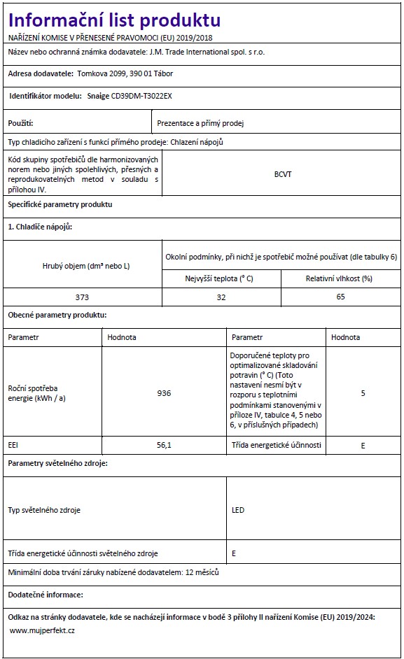 Chladnička vitrína Snaige CD39DM-T3022EX je spolehlivým a praktickým řešením pro efektivní chlazení a atraktivní prezentaci nápojů. Její promyšlený design a funkční vlastnosti pomohou zvýšit prodej a uspokojit potřeby vašich zákazníků.