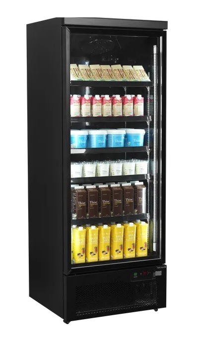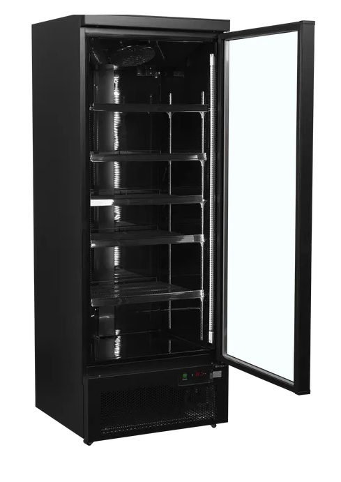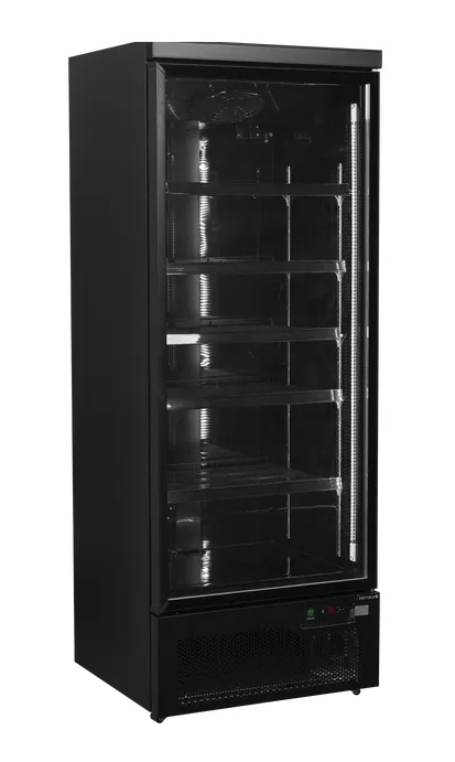Chladicí vitrína TEFCOLD Atom Maxi C1DBB v elegantním černém provedení interiéru i exteriéru vytváří moderní vzhled, který přitahuje zákazníky a zvýrazňuje vaše produkty. Vnitřní svislé LED osvětlení zajišťuje vynikající prezentaci zboží a zároveň je energeticky úsporné. S čistým objemem 459 litrů a výstavní plochou 0,98 m² nabízí dostatek místa pro širokou škálu nápojů a potravin. Samozavírací prosklené dveře na pantech s dvojitým tvrzeným sklem přispívají k udržení stálé teploty a nízké spotřebě energie.