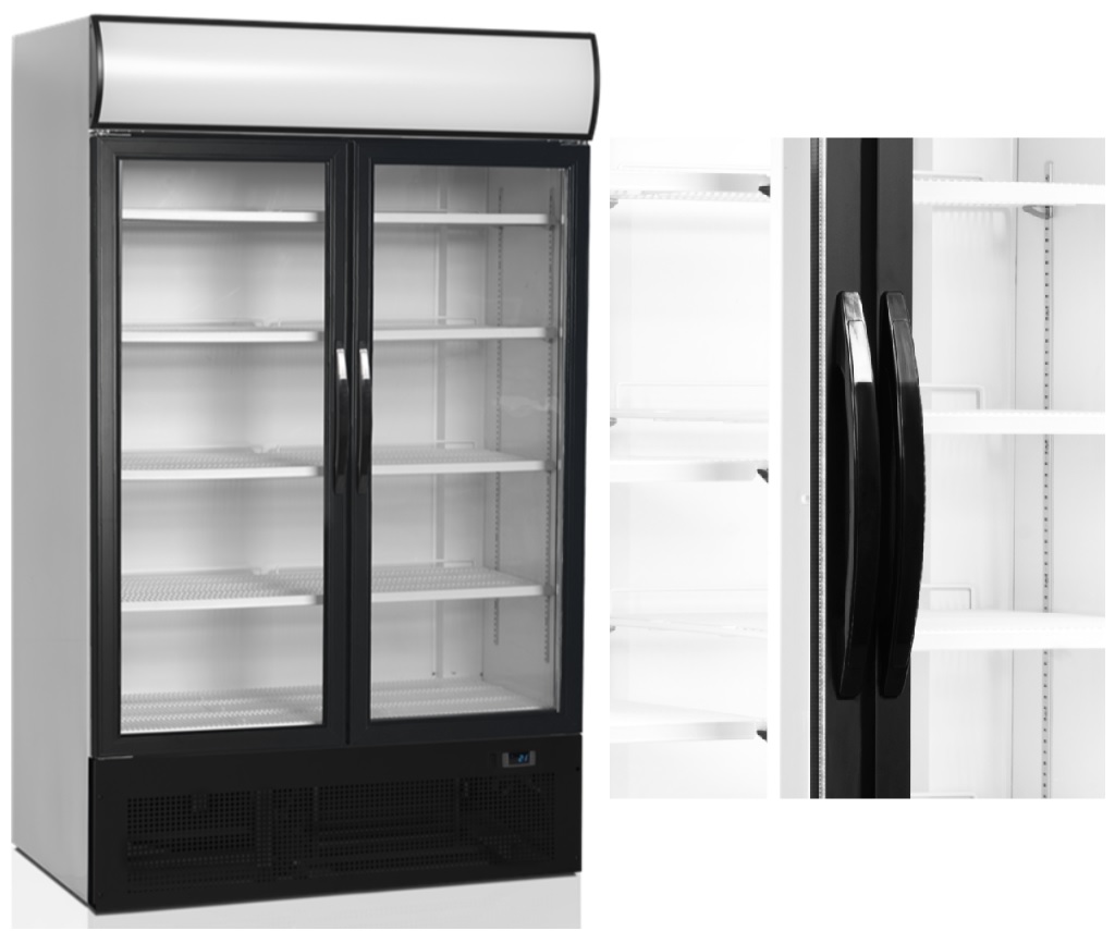 TEFCOLD FSC 1200 H chladicí skříň prosklenými křídlovými dveřmi a výraznou světelnou nástavbou v horní části jsou ideálním vybavením pro prodejny, markety, čerpací stanice či večerky. Jejich vertikální LED osvětlení vnitřního prostoru a reklamní panel s LED osvětlením zajišťují skvělou prezentaci produktů a přitahují pozornost zákazníků. Skříně jsou vybaveny dvěma vnitřními ventilátory, ventilovaným chlazením a prosklenými křídlovými dveřmi s hliníkovým rámem, což zaručuje efektivní distribuci chladu a nízké nároky na údržbu. Nastavitelné police umožňují flexibilní uspořádání produktů a optimální využití prostoru.