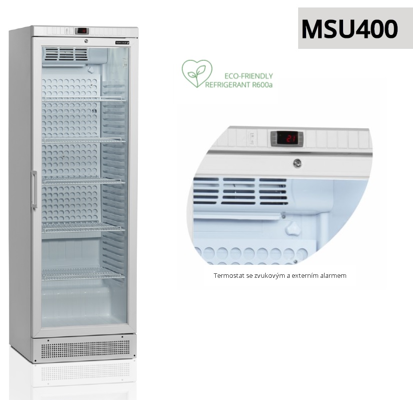 TEFCOLD MSU 300 chladící skříň prosklenná je vybavena prosklenými křídlovými dveřmi, které umožňují snadnou vizuální kontrolu obsahu bez nutnosti otevření. Skříně disponují elektronickým termostatem pro přesné nastavení a udržení požadované teploty. Akustický alarm a možnost připojení externího alarmu poskytují dodatečnou úroveň bezpečnosti, upozorňující na odchylky od nastavené teploty. Nastavitelné police umožňují flexibilitu při uspořádání a přizpůsobení prostoru podle potřeb uživatele. Automatické odmrazování a chlazení s pomocným ventilátorem zajišťují efektivní a energeticky úsporný provoz. Nastavitelné nožky usnadňují stabilní umístění skříně na různých površích, a vnitřní LED osvětlení přispívá k lepší viditelnosti obsahu. Tyto funkce dělají z chladicích skříní MSU spolehlivý a praktický nástroj i pro zdravotnická zařízení a laboratotní zařízení.