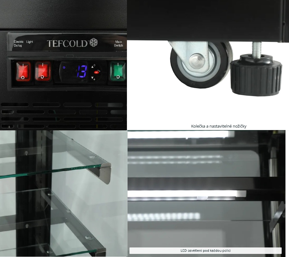 • Snadná mobilita: Vitrína je osazena 4 robustními kolečky, díky kterým ji lze v rámci provozovny libovolně přemístit bez nadměrné námahy.