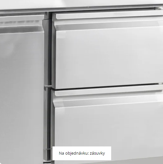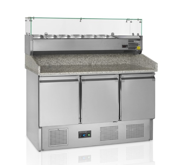 Řada PT chladicích pizza stolů je vyrobena z nerezové oceli SS304. Má žulovou desku, která je pro přípravu pizzy ideální, protože žula zůstává chladná a těsto se na ni méně lepí. Stoly jsou k dispozici v několika velikostech se 2 nebo 3 dvířky. Také je možné pořídit si přizpůsobenou variantu se zásuvkami. Dodává se s horní jednotkou pro gastronádoby GN nebo bez ní – horní jednotku lze dodatečně namontovat. Tento model, TEFCOLD PT 1365 + VK33-140, je dodáván s nástavbou.