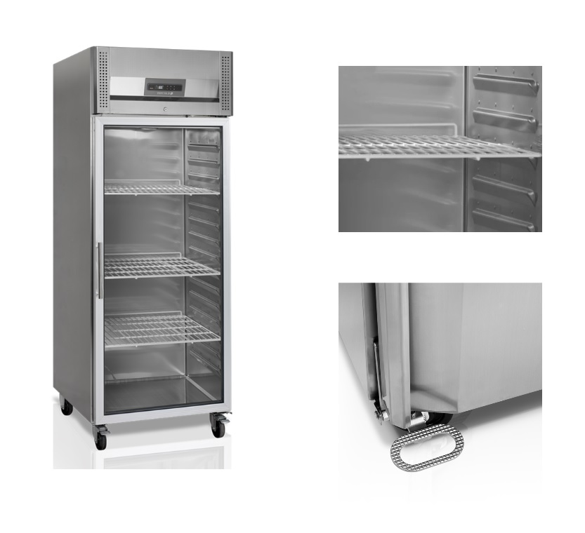 TEFCOLD GUC 70: Celonerezová chladicí skříň (528 l) pro GN2/1 přepravky. Ideální pro gastro provozy. S ventilovaným chlazením, digitálním termostatem, zámkem, samozavíracími dveřmi a tichým chodem. Spolehlivá a úsporná.