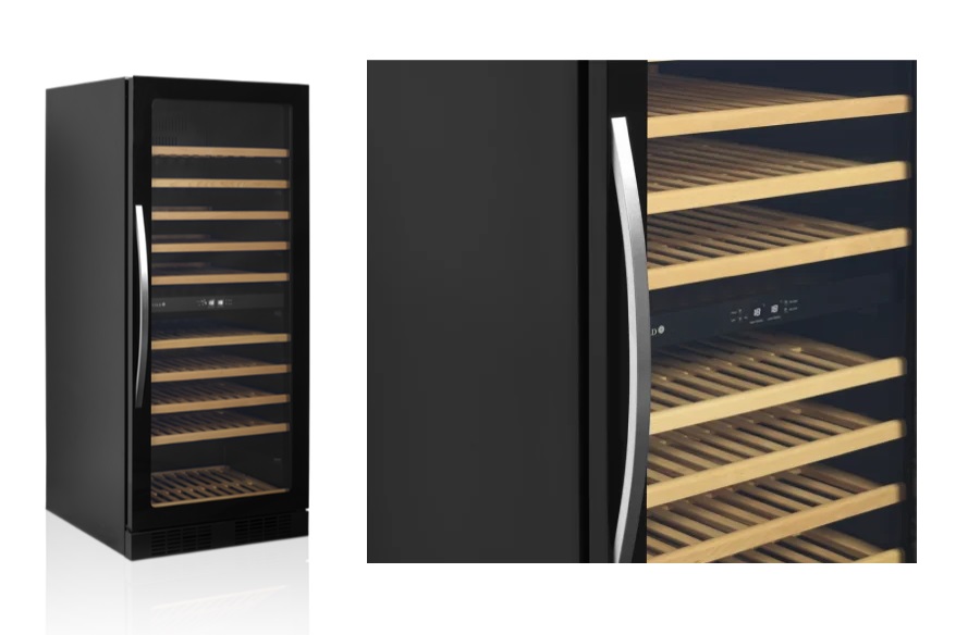 TEFCOLD TFW 160 S je elegantní vinotéka (141 l) s kapacitou 45 lahví, ideální pro restaurace, hotely a vinotéky. Nabízí LED osvětlení, výsuvné dřevěné police, ventilované chlazení a tichý chod (40 dB).