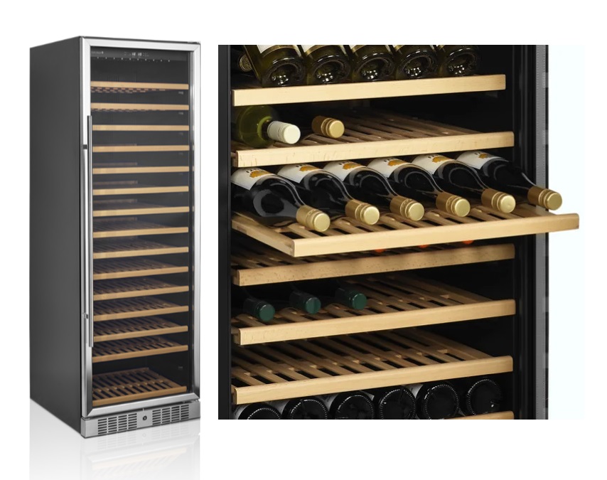 TEFCOLD TFW 160 S je elegantní vinotéka (141 l) s kapacitou 45 lahví, ideální pro restaurace, hotely a vinotéky. Nabízí LED osvětlení, výsuvné dřevěné police, ventilované chlazení a tichý chod (40 dB).