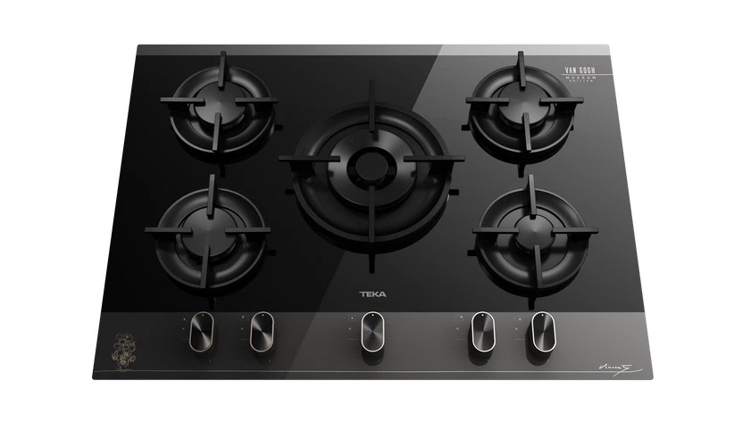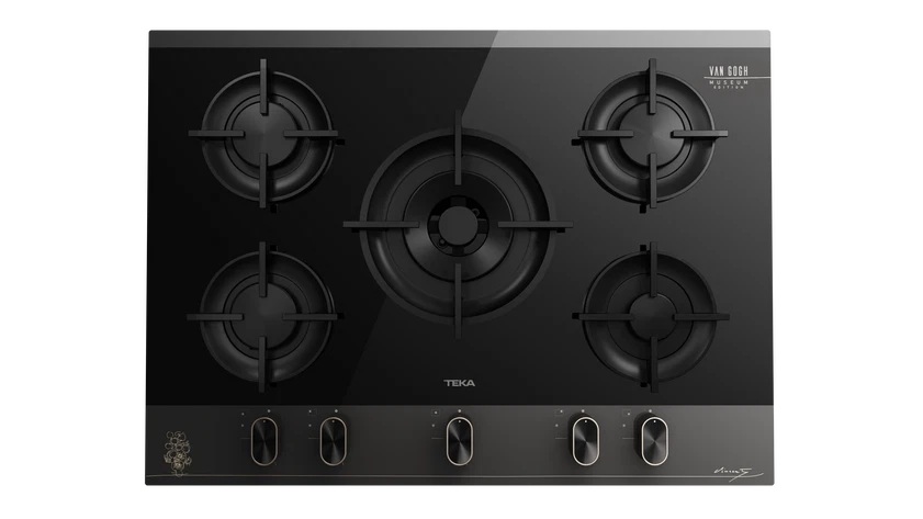 Plynová varná deska TEKA Van Gogh GBC 75 VB VG s šířkou 70 cm je luxusní model ze speciální Edice Van Gogh. Vyniká elegantním dvoubarevným provedením v černém skle a tmavě šedé s detaily v barvě šampaňské. Deska je osazena pěti vysoce výkonnými hořáky a ergonomickými otočnými ovladači.