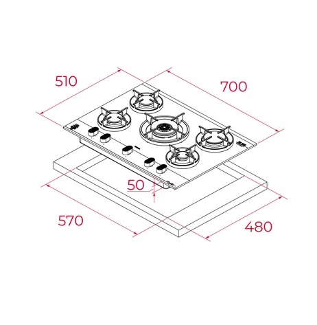 • Typ a rozměr: Skleněná plynová varná deska s šířkou 70 cm.