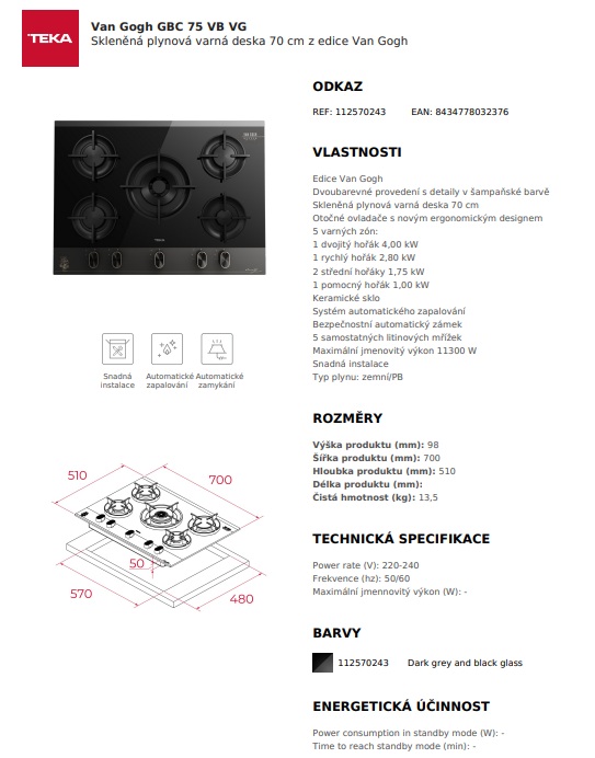 TEKA Van Gogh GBC 75 VB VG: Skleněná plynová varná deska (70 cm)