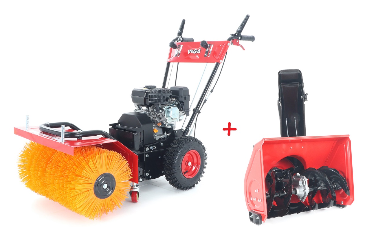VeGA 555 4in1: Motorový zametací rotační kartáč (60 cm) s motorem LONCIN 196 cm3. Nabízí 5 rychlostí vpřed a 2 vzad, nastavitelný směr kartáče. Lze rozšířit na sněhovou frézu, sběrný koš nebo radlici (příslušenství nutno dokoupit).