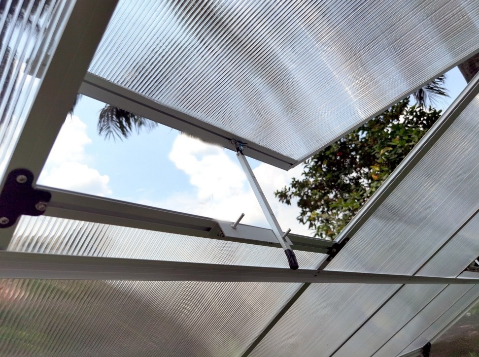 Konstrukce: Zesílené eloxované hliníkové profily s hlubší drážkou 10 mm pro zasunutí polykarbonátových desek. Tato moderní konstrukce zajišťuje vysokou pevnost a stabilitu skleníku.
