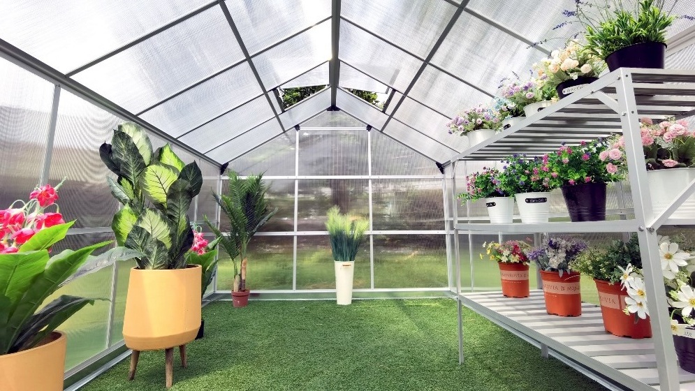 Konstrukce: Zesílené eloxované hliníkové profily s hlubší drážkou 10 mm pro zasunutí polykarbonátových desek. Tato moderní konstrukce zajišťuje vysokou pevnost a stabilitu skleníku.